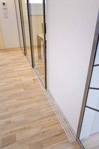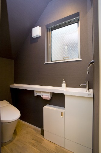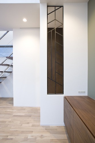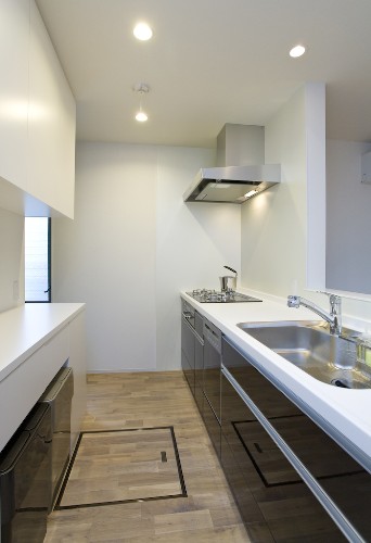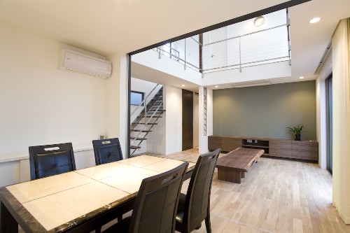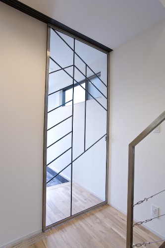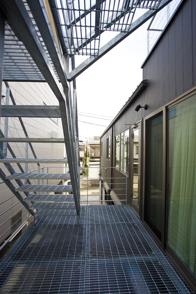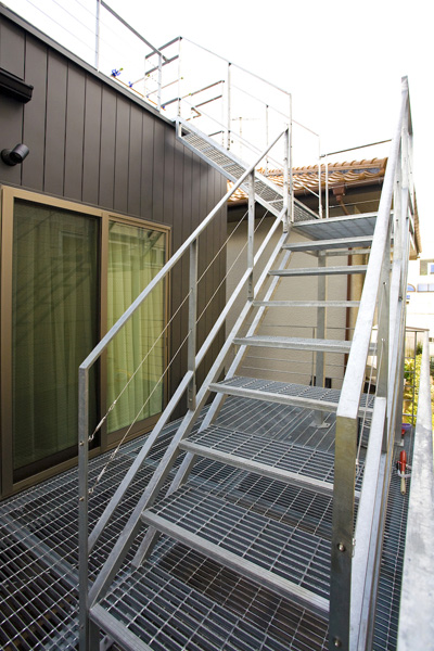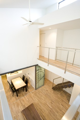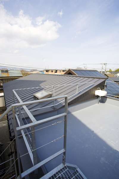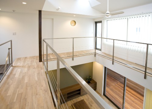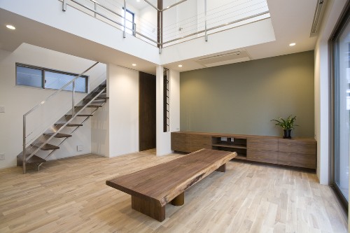 | POINT | 「家族が自然と集まれる家を」というご要望のもと、家の中心にリビングを配置し、家のどこに居ても家族の気配が感じられ、またどこへ行くにもリビングを通るようなデザインにしました。全体的に明るくなるよう床・壁・天井とも白を基本に、アクセントカラーはリビングのTVボード、ローテーブルのブラックウオルナットの深い紫茶と壁面のブルーグレイに。落ち着きのある「大人可愛い」色合いで引き締めました。 ステンレスやスチールの建具、階段・デッキ・格子などは、お施主様も一緒に構造や意匠など頭をひねってつくり上げた結果です。ご覧の通り既製品にない手造り感と温かみのある仕上がりになりました。 |