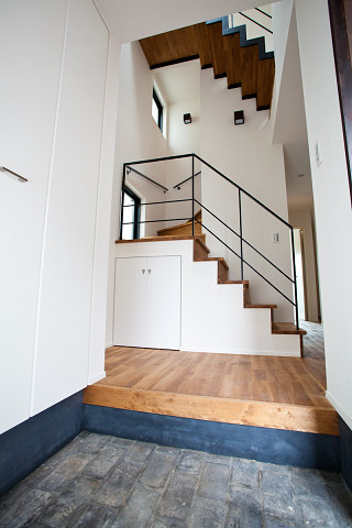 | POINT | お施主様の奥様がOBのお施主様(茅ヶ崎M様)のご友人で、その建物をご覧になられたことからご来社くださいました。 お付き合いは土地の購入前から。土地を拝見し、設計面その他でいろいろとアドバイスもさせていただきました。ちょうど東北大震災の前後の着工ということもあり、ご自身でも何か協力したいというお気持ちから、太陽光発電の設置も行いました。設計面で注目していただきたいのは、玄関上がってすぐの階段をからめた吹き抜けと、リビングの勾配天井による空間の演出、そして格子によるロフトとの緩やかなつながり、などです。またビルトインガレージの外壁羽目板が、外観のアクセントとなっています。 A邸は海まで徒歩1分の立地。ご夫婦共にサーフィンをされるので、砂などが目立たないようにと玄関のたたきに上海レンガを敷きました。 床材のラスティックバーチのザラついた風合いと、上海レンガの質感の相性が良く、海沿いの家としてふさわしい雰囲気が出せたと思います。 上海レンガ、サッシ枠、階段手摺と、ブラック色で引き締め、全体的にシックな印象に仕上げました。 |