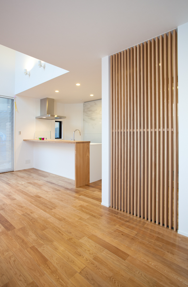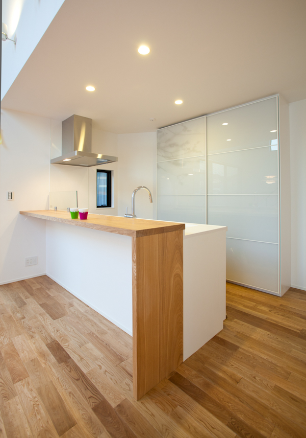 | POINT | お施主様は以前よりエバーのことを知ってみえたことから、エバーの家づくりの特徴をご存知で、打ち合せもとてもスムーズでした。積極的にお考えいただくこともあり、つねにイメージを共有しながら進めることができました。 設計面では、当初からのお施主様の好きなイメージが明確だったため、つまづくこともとくにありませんでした。お施主様の持っている家具や照明等に合わせ、タモやナラの材を取り入れ、落ち着いた雰囲気を創り出していきました。また、明るい色の土間の洗い出しや、「IKEA」の扉を利用したキッチン造作収納などは、お施主様と一緒に意見を出し合いながら作り上げていくことができました。土間に配置したトイレもこのお宅の特徴と言えます。 |