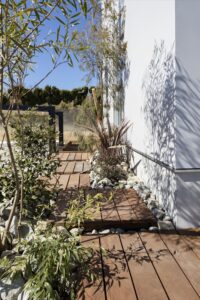 敷地は袋小路の奥にあり、脇道には地域の方々が生活動線として使う小道があります。小道を挟んだ東側の住宅地とは高低差があり、本邸は少し高い位置にあります。高低差があることで向かいの家の屋根越しに大磯丘陵が綺麗に見える、とても魅力的な周辺環境です。
