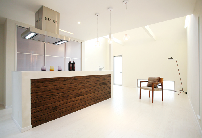 吹抜けのリビングとダイニングキッチン。隣接するウッドデッキ。開け放つと3つの空間がひとつになって調和します。