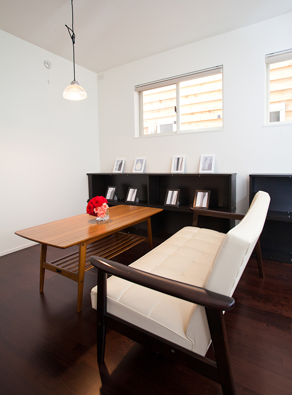 | POINT | 土地のご相談から承ったお客様で、土地と建物両方をご提案し、このようなかたちとなりました。設計面では、大きな勾配天井のリビングの梁にハンモックを吊るすことを計画されたりと、住まいを楽しもうという姿勢をお持ちで、楽しく仕事をさせていただくことができました。 コーディネートとしては、たくさんの本をお持ちで階段に大容量の本棚を設置したり、キッチンはお料理好きな奥様のご要望をもりこみ大型食洗器をビルトイン、通常より間口の広いものをセレクトいたしました。無垢のブラックウォルナットで製作した大きめのダイニングテーブルも、大勢のご友人との集いに活躍しそうです。ソファを置かず小上がりスペースを寛ぎの場として考えたり、スイッチのデザインひとつについてもこだわってご提案させていただきました。 |