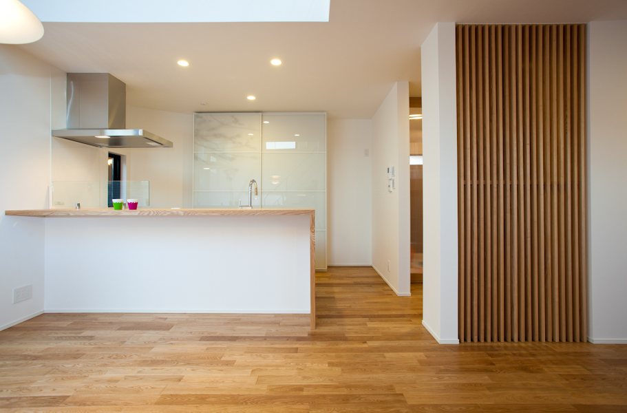 | POINT | お施主様は以前よりエバーのことを知ってみえたことから、エバーの家づくりの特徴をご存知で、打ち合せもとてもスムーズでした。積極的にお考えいただくこともあり、つねにイメージを共有しながら進めることができました。 設計面では、当初からのお施主様の好きなイメージが明確だったため、つまづくこともとくにありませんでした。お施主様の持っている家具や照明等に合わせ、タモやナラの材を取り入れ、落ち着いた雰囲気を創り出していきました。また、明るい色の土間の洗い出しや、「IKEA」の扉を利用したキッチン造作収納などは、お施主様と一緒に意見を出し合いながら作り上げていくことができました。土間に配置したトイレもこのお宅の特徴と言えます。 |