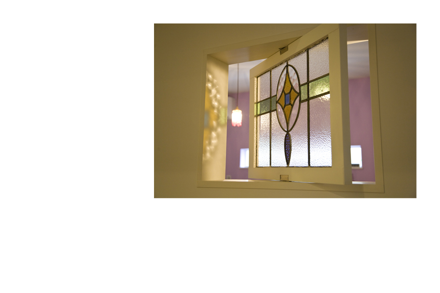 また、リビングには薪ストーブの暖炉を据え、随所にアンティーク調のステンドグラスを。その少し翳りのある光が、さらにこの邸の居心地の良さを表現しています。前述の洗面化粧台のほかにも、TVボード、食器棚、チェスト、本棚等がすべて造作です。